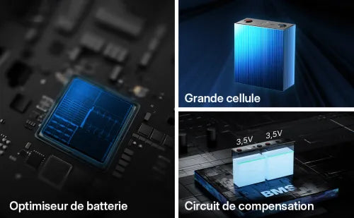 Les cellules de grande taille, l’équilibrage dédié et l’optimiseur de batterie éliminent les déséquilibres internes. Cette gestion avancée maximise l’énergie réellement utilisable et prolonge significativement la durée de vie du système.
